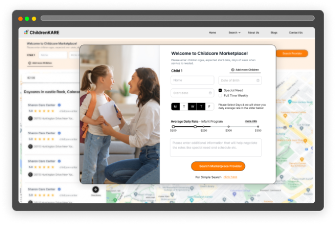ChildrenKARE is a smart childcare marketplace that connects parents with verified daycare centers, preschools, and family care providers. Simply enter your location to search, compare rates, read parent reviews, and use our exclusive negotiation service to secure the most affordable childcare prices in your area.